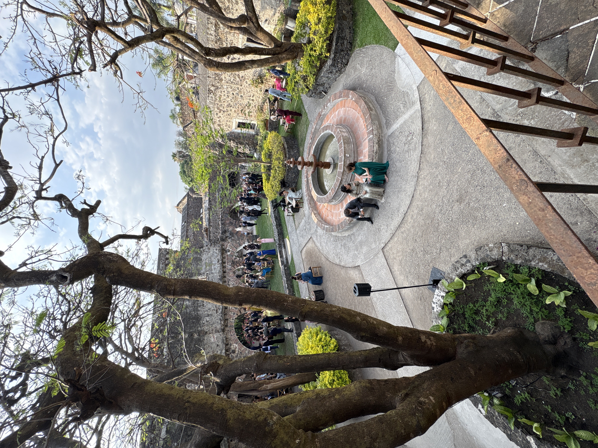An outdoor event is occurring on the stone patio of an historical building or garden. People are seated in chairs, possibly for a ceremony or presentation. A circular stone and brick fountain is at the center of the patio. A tree with bare branches frames the view, with some foliage visible. To the right, a rusty metal staircase is visible, providing an elevated perspective of the scene. The location is Progreso, Mexico.