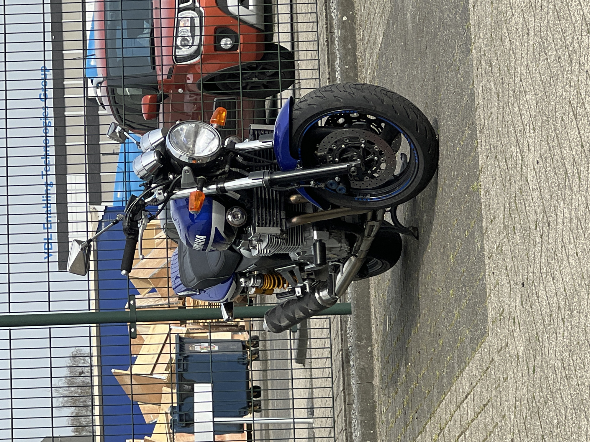 A blue Yamaha motorcycle is parked on a kickstand on a paved concrete surface, consisting of rectangular pavers with patches of moss, in an outdoor industrial or commercial area in Eindhoven, Netherlands. The motorcycle, oriented slightly towards the left with its right side more prominent, features a chrome round headlight, orange front turn signals, disc brakes on the front wheel with blue rim accents, an exposed engine, and a black exhaust pipe partially wrapped in a patterned material. Behind the motorcycle, a black metal mesh fence with a green vertical post separates the foreground from the background elements. Through the fence, a partial view of a red/orange SUV is visible to the right of the motorcycle. To the left, behind the fence, multiple stacked light-colored wooden crates and a dark blue industrial waste bin on wheels are present. In the background, a large building with a blue lower section and a lighter upper section displays the partial text "VBL Enabling Technologies Group". The scene is under natural illumination, with shadows cast on the ground, suggesting bright daylight under an overcast sky. No individuals are visible.