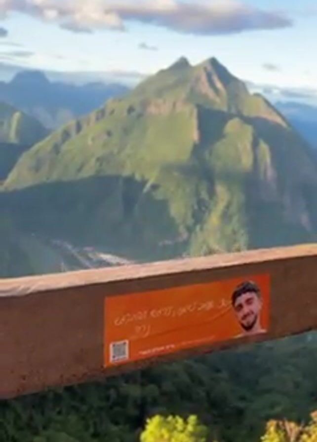 scenic view of mountains and a town nestled in a valley. The shot is taken from a high vantage point, possibly a viewpoint or lookout, with a wooden railing in the foreground. Affixed to the railing is an orange sticker or banner with a picture of a person and text in a foreign language. The mountains are lush with greenery, and the sky is blue with scattered clouds. The town is visible in the valley, next to a river.