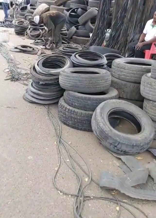 street scene filled with a large collection of used tires and tire components. A man is working among them, picking up and sorting tire rings. There are stacks of whole tires and piles of tire rings of various sizes. Long strands of wire are laid out on the ground. In the background, there are buildings, cars, and pedestrians. One man sits on a red plastic chair.