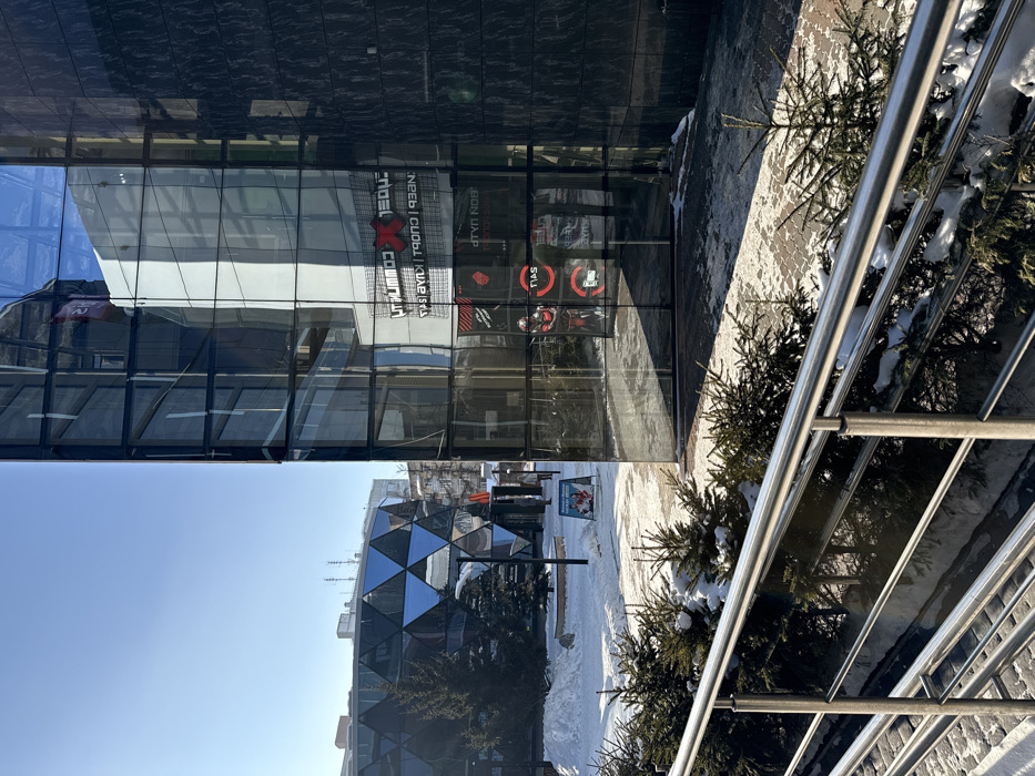 A modern building with glass facade is seen reflecting the sky and another building. The first building features text and logos behind the glass. Outside, a walkway has short evergreen trees with patches of snow. A metal railing runs along the walkway. The sky is blue and clear.