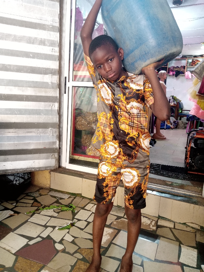 A young, barefoot male, approximately pre-adolescent, with dark skin and short dark hair, stands facing forward, looking directly at the camera. He wears a short-sleeved button-up shirt and matching shorts, both patterned with gold chains, ornate scrollwork, and plaid on a brown, black, and beige background. He carries a light blue plastic barrel on his head and right shoulder, supported by his raised left arm. To his left is a corrugated metal wall with horizontal grey and white stripes. Behind and to his right is a glass door with a white frame, revealing the interior of a shop or stall. The interior contains shelves displaying items, mannequins, and various clothing, including a multi-colored ruffled dress. A partial view of a fair-skinned individual or mannequin is visible further back inside the shop. A dark-colored generator-like object rests on the floor to the far right. The ground beneath the boy is tiled with an irregular mosaic pattern of light brown, beige, and darker brown pieces. A green and black patterned strap or fabric piece lies on the floor near the boy's left foot. The location is Unknown, Unknown.