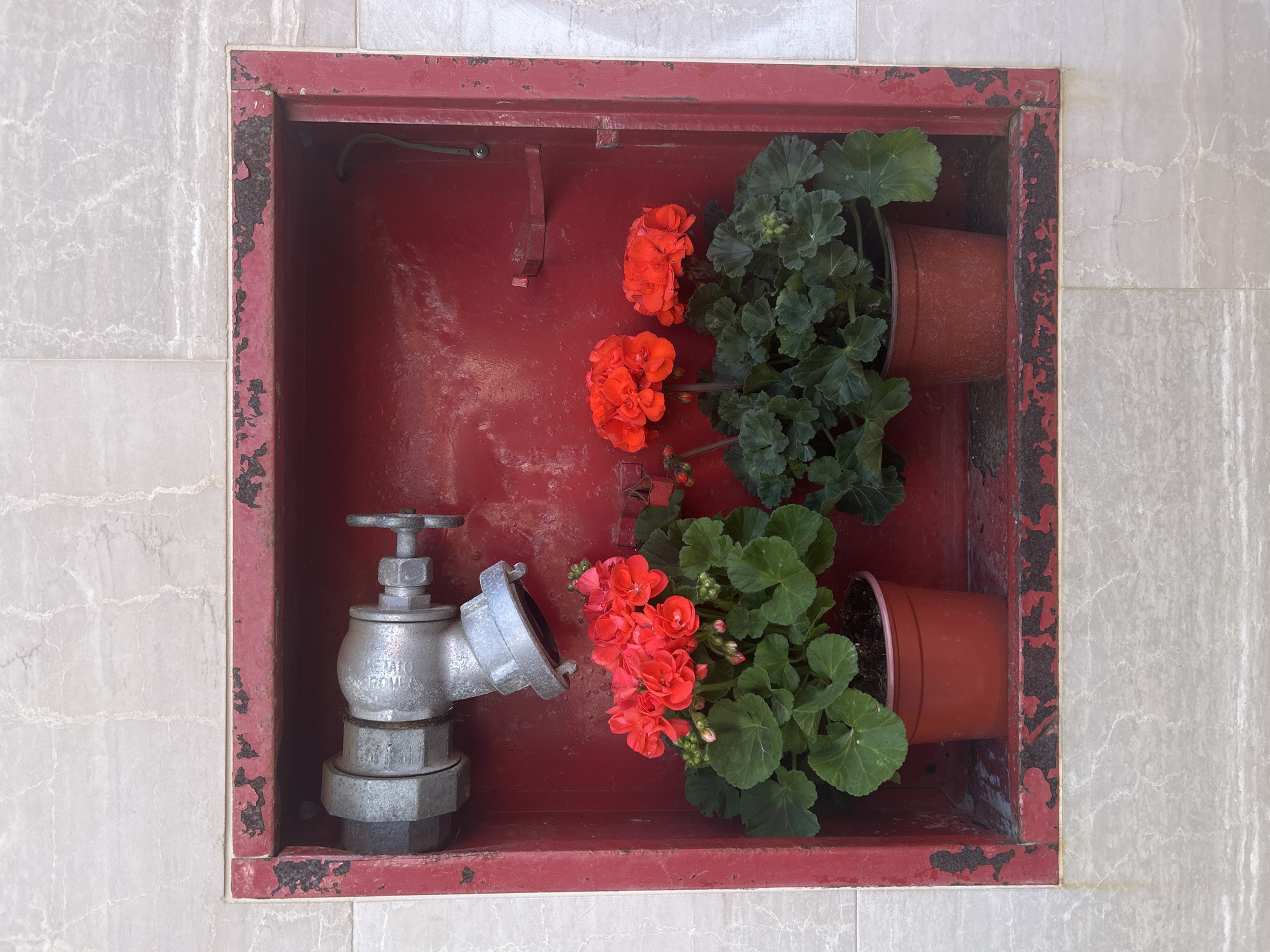 A red fire hydrant cabinet is recessed into a light gray tiled wall. The cabinet contains a silver hydrant valve with a handle and two potted geraniums with red flowers. The red paint on the cabinet is chipped and peeling. The location is Budva, Montenegro.