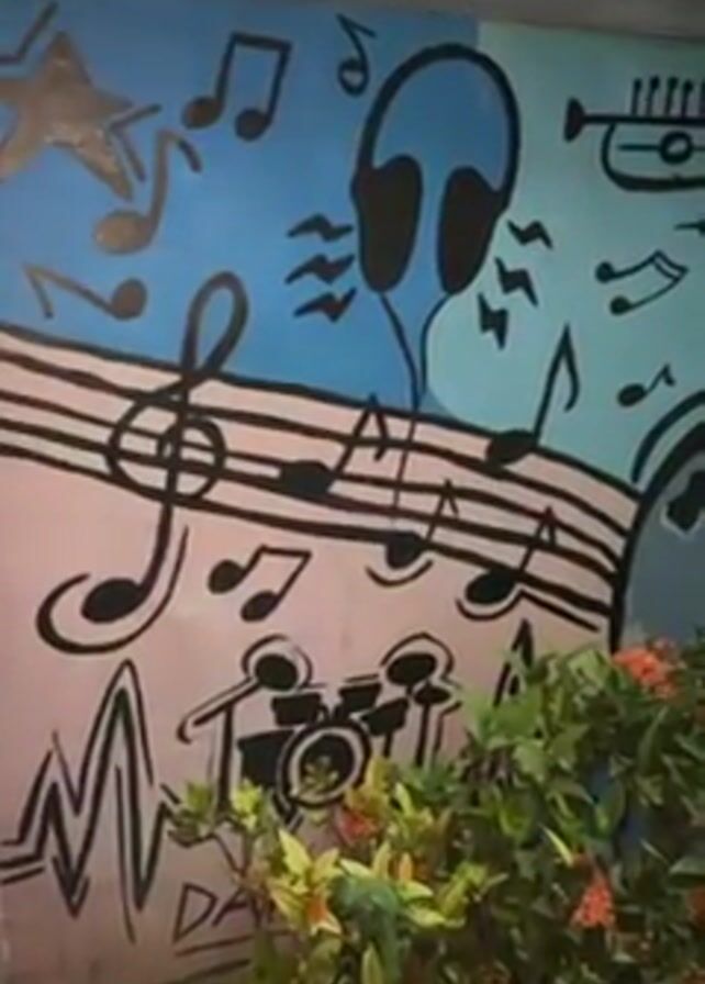 colorful mural painted on an exterior wall at night. The mural has a blue and pink background, with black music-related images painted on top, including a treble clef, musical notes, headphones, a drum set, a trumpet, and a guitar. There are also some words written on the mural, including “Sounds” and "Dance". Green plants with orange flowers are growing in front of the wall.