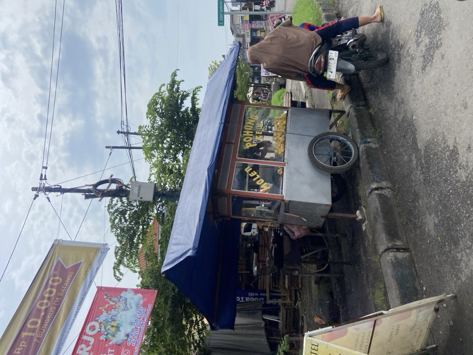 A person on a motorcycle stops by a food cart labeled "Pohong Keju" and "Molen