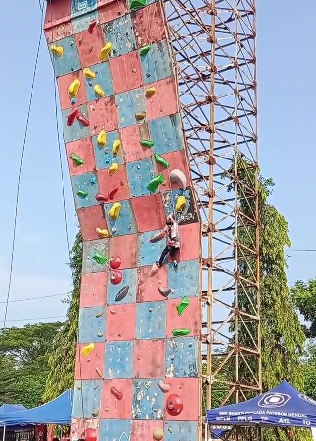 A wide shot depicts an artificial rock climbing wall, constructed from a metal framework and covered in a patchwork of alternating red and blue squares. Various colored climbing holds, predominantly yellow, green, and red, are attached to the wall. A young person wearing a helmet and safety harness is climbing the wall, moving upwards using the holds. To the right of the climbing wall, there's a tall metal framework, and a cluster of green trees are visible behind it. In the lower part of the frame, to the left, there are people standing near blue tents. On the right side, another blue tent is visible, displaying the text "SMK BHAKTI MUDA PATEBON KENDAL." A few people are standing around and observing the climber. The sky is clear and blue.
