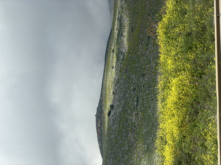 The image depicts a natural landscape within the Galil Elyon Regional Council, Israel, under a partially cloudy sky. The foreground features a dense field of vibrant yellow flowering plants and green foliage, with a light-colored horizontal barrier, likely a guardrail, partially visible at the bottom edge of the frame. Rising behind this foreground vegetation is a prominent hillside, extensively covered with light grey rocks and sparse green growth, interspersed with smaller yellow blossoms. Sections of the mid-slope are brightly illuminated by direct sunlight, creating a stark contrast with adjacent shadowed areas. Several small, dark green shrubs are scattered across the rocky incline. The hill culminates in a rounded summit in the background, characterized by a rocky outcrop and a singular small tree or bush at its peak. The sky above is dominated by thick, dark grey clouds, particularly dense on the right side, while the upper left exhibits areas of brighter, diffused light. No people or animals are visible in the scene.