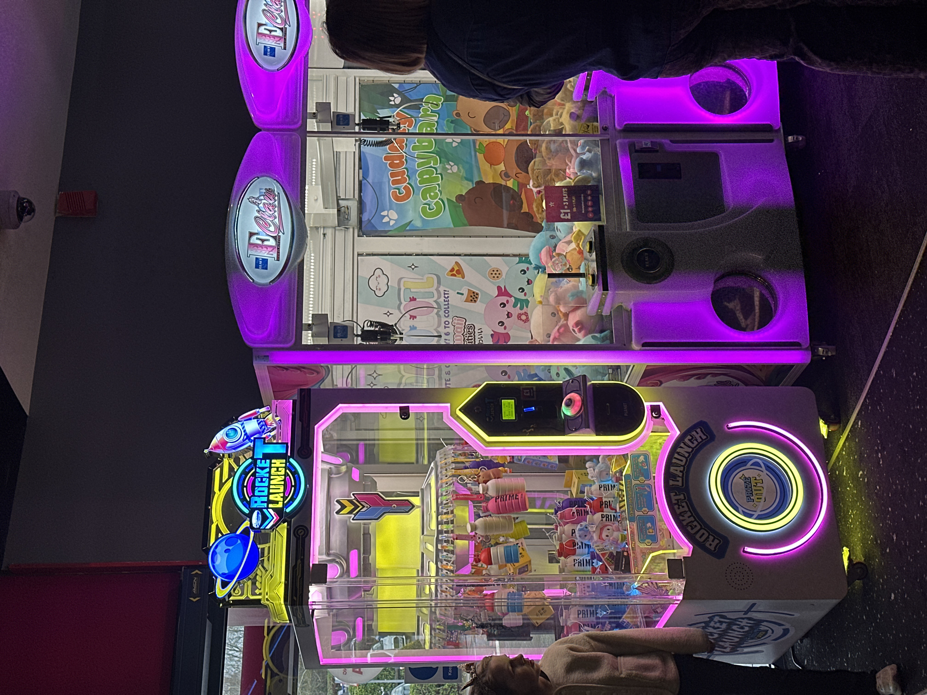 The scene depicts an interior view of an entertainment venue, likely a cinema or leisure center, within the Tonbridge and Malling area of the United Kingdom. Three illuminated arcade claw machines are prominently featured. On the left, a "Rocket Launch" claw machine with a silver-grey frame and clear acrylic panels dominates. Its top marquee displays "Rocket Launch" in a blue and pink planetary/rocket motif, accented by neon yellow and pink lighting along its edges. The machine's interior contains numerous "Prime Hydration" bottles in various colors (blue, pink, red, white, purple), alongside small plush toys and novelty items, including Sanrio characters. A vertical control panel on its right side features a coin slot, a joystick, and a large circular "PRIZE OUT" opening at the bottom, all framed by neon illumination. To the left of this machine, a young female, appearing as a child or pre-teen, with light brown hair pulled back, stands wearing a light-colored fleecy top and dark trousers. She faces the machine, observing its contents or play area. Her left foot, wearing a light-colored trainer, is visible on the floor. Adjacent to the "Rocket Launch" machine are two "E Claw" claw machines, uniformly designed with dark grey textured frames and purple neon edge lighting. Their top marquees are oval, displaying "E Claw" and a small "ELAUT" logo, also illuminated in purple. The left "E Claw" machine has a backdrop featuring pastel-colored cartoon characters, while the right machine's backdrop shows cartoon bears and text reading "Cuddly Capybara". Both "E Claw" machines are filled with various plush toys, including capybaras and axolotls. A price sign on the right machine indicates "£1 = 3 PLAYS" and "50p = 1 PLAY". To the right, an adult female, viewed from the back-right, with short brown hair and wearing a dark blue or black long-sleeved top and dark trousers, stands in front of the right "E Claw" machine, appearing to engage with it. The floor is a dark, textured surface, possibly carpet or tiling. The background wall is dark grey/black, with a section of red wall visible on the far left. A white dome-shaped CCTV camera and a red rectangular fire alarm are mounted on the ceiling and upper wall, respectively. Reflections in the "Rocket Launch" machine's glass reveal a blurred outdoor environment with trees, parked vehicles, and a partial "AVON" sign, indicating proximity to an exterior space like a car park or street. The scene is artificially lit, with the bright neon and LED lights of the arcade machines providing the primary illumination.
