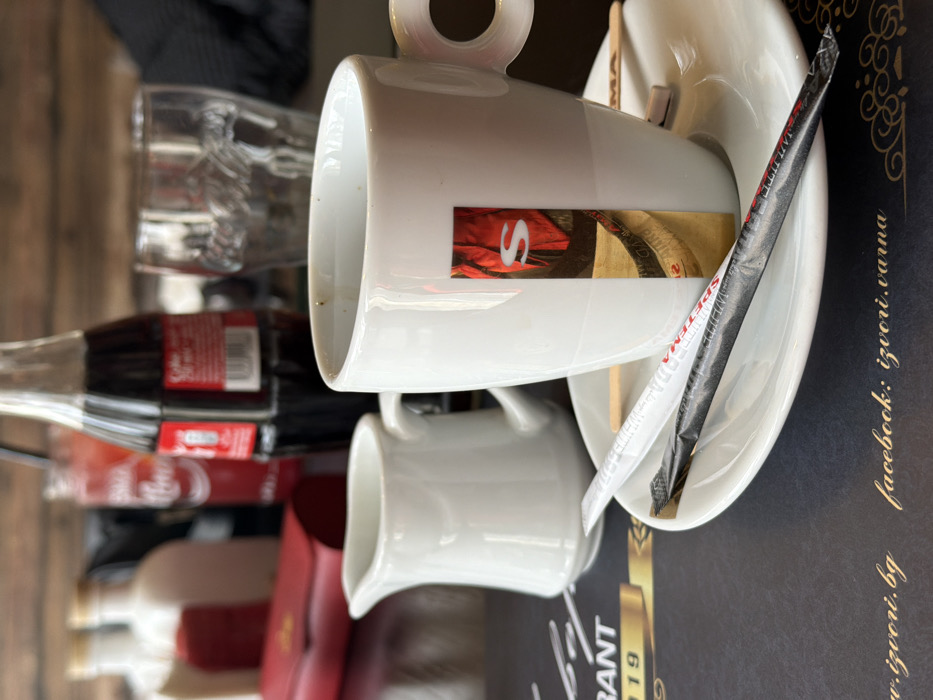 A forensic examination of the image reveals a tabletop scene within a restaurant or cafe in Lyuben Karavelovo, Bulgaria