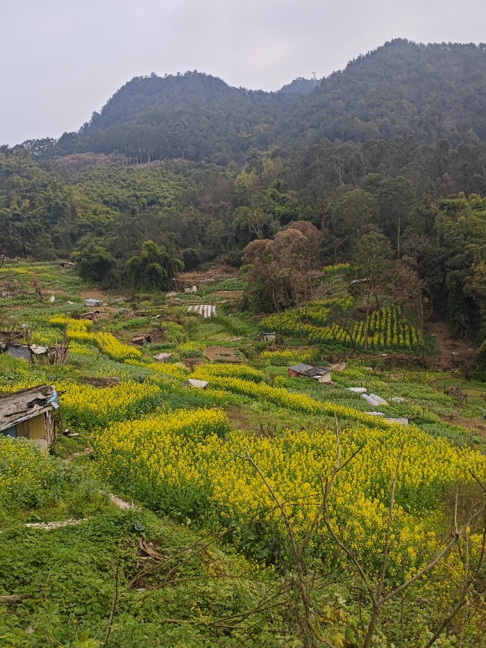 The image displays a rural mountainous agricultural landscape situated in Bishan, China, under an overcast sky. The foreground is characterized by dense green undergrowth and scattered bare tree branches. The midground features extensively terraced hillsides predominantly cultivated with vibrant yellow flowering crops, consistent with rapeseed or mustard fields. Numerous small, single-story structures with dark roofs and light-colored walls, appearing as sheds or shelters, are distributed throughout these cultivated areas. Several translucent white plastic tunnels, likely row covers or mini-greenhouses, are visible within the crop patches. Interspersed among the yellow fields are sections of green vegetation and tilled earth. The background consists of steep, heavily forested mountains covered in a dense mix of green trees, including bamboo groves and some deciduous trees exhibiting lighter brown foliage. No individuals or active interactions are visible within the scene.