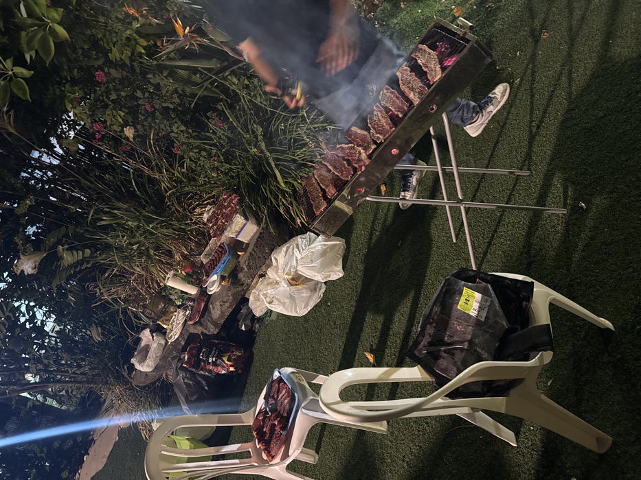 The image depicts an outdoor night-time barbecue scene in a residential backyard or patio in Kfar Yona, Israel
