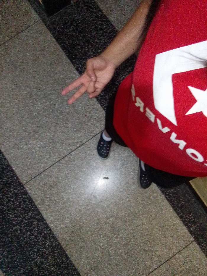 A high-angle, partial view depicts an individual standing indoors. The subject's right arm is extended, with the hand forming a two-finger V-sign. They are wearing a red t-shirt with the white, inverted text "CONVERSE" and the associated star logo, dark lower garments, white socks, and black Crocs-style clogs on both feet. The flooring consists of light grey speckled terrazzo tiles separated by dark, highly speckled linear tile sections. A concentrated reflection of light is visible on the lighter tile surface. The specific location within Meknes, Morocco, cannot be determined from the visual evidence.