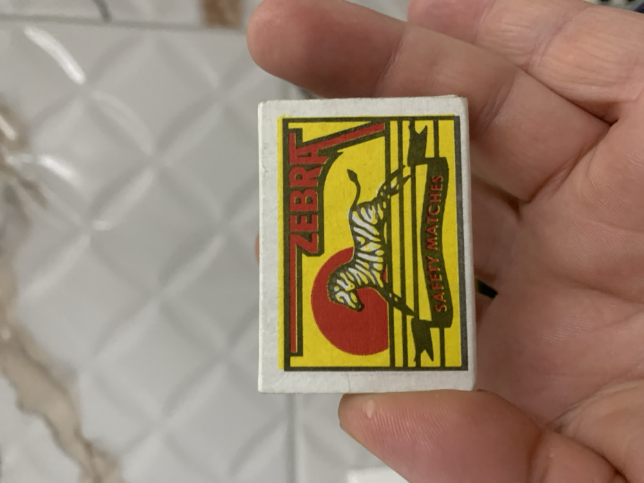 An adult human hand holds a rectangular white matchbox, presenting its front label directly to the viewer