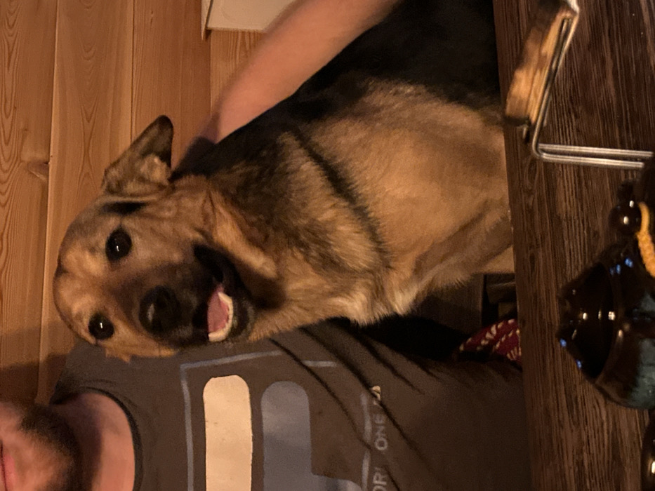 A German Shepherd dog is lying on a person's chest. The dog has brown and black fur and its tongue is visible. The person is wearing a gray t-shirt. The background includes wood paneling on a wall, and part of a table or furniture piece with a metallic element and a decorative object are visible on the right side of the frame. The picture is oriented sideways.