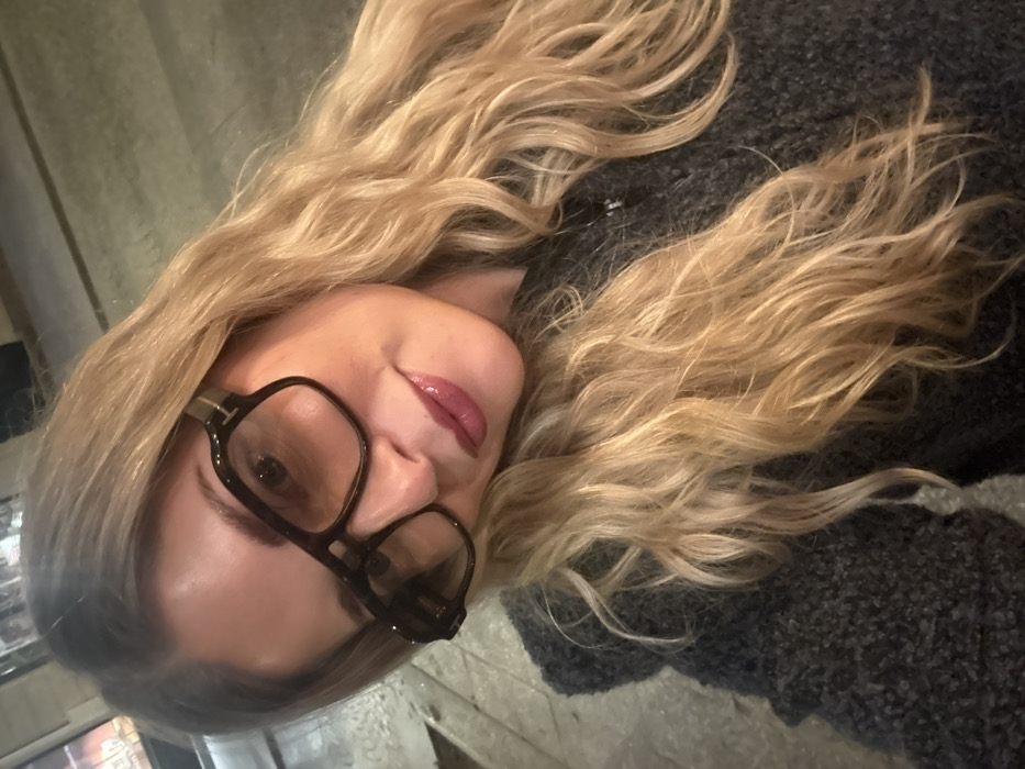 A blonde woman with long, wavy hair poses wearing dark-framed glasses. She's positioned close to the camera with her head tilted. Her makeup includes lipstick, which is apparent. The background is unclear, but suggests an indoor location. She is wearing a dark, textured sweater or top. The image appears to be a selfie or a photo taken at close range.