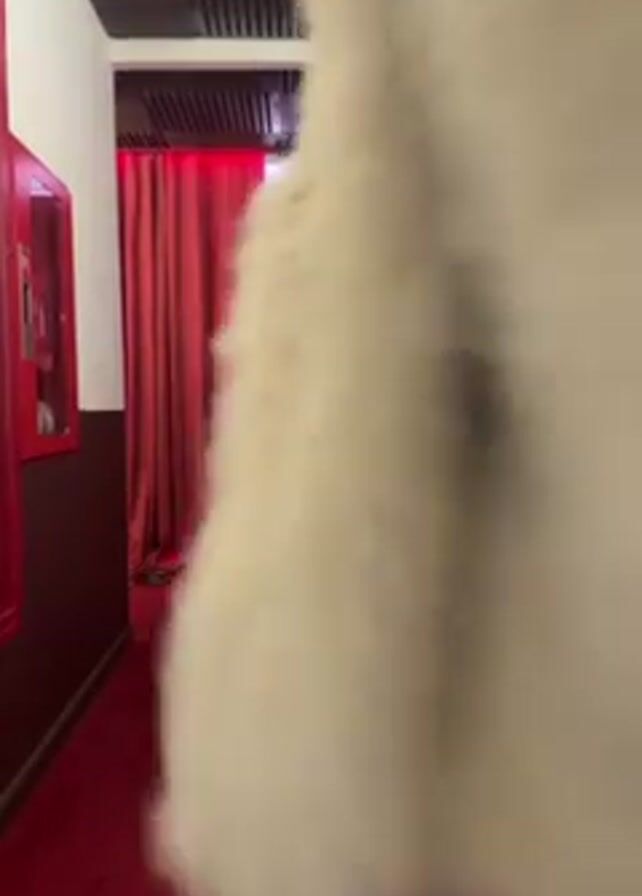 woman walking towards the camera in a hallway. The hallway has a red carpet and red curtains at the end. The walls are white with brown paneling on the bottom half, and there are framed pictures on the walls. The ceiling has a dark grey, textured design. The woman is wearing a beige fur coat, a black slip dress, and red high heels. She stops in the middle of the hallway and poses for the camera.