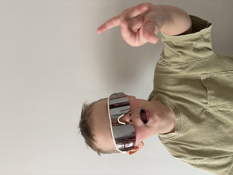 A young child, estimated to be between four and six years old, is captured in a medium close-up against a plain, light grey wall in Chaikovsky, Russia. The child wears oversized white-framed sunglasses with reflective, mirrored lenses that obscure the eyes. The hair is light brown and appears somewhat disheveled. The child is dressed in a light olive green short-sleeved t-shirt featuring a small pocket on the left chest. The mouth is open in an "O" shape. The child's right hand is raised, with the index finger extended upwards and slightly forward in a pointing gesture. The scene is illuminated by soft, even lighting, suggesting an indoor environment.
