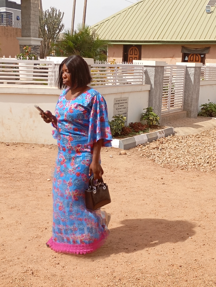 An adult female, with dark skin and a short, dark bob haircut, walks on a reddish-brown dirt path. Her body is angled towards the right side of the frame, while her head is turned slightly to her left, looking down at a silver-colored smartphone held horizontally in her left hand. In her right hand, she carries a small, dark, textured handbag with silver-colored hardware. She wears a full-length, loose-fitting blue dress adorned with a pink floral pattern, featuring wide, flowing sleeves and a bright pink fringed hem. Her distinct shadow is cast on the ground to her right. The scene takes place in a residential area of Jos, Nigeria. In the mid-ground, a white concrete fence with horizontal slatted sections and grey pillars runs parallel to the path. A white plaque mounted on the fence wall reads, in part, "THIS PROJECT WAS CONSTRUCTED BY AHMADU GANDI FOUNDATION OF NIGERIA (AGF) COMMUNITY AND THE FAMILY OF MALAYU MAINA IN MEMORY OF THEIR BELOVED PARENTS." Behind the fence, a single-story house with light peach-colored walls and a light olive-green corrugated metal roof is visible, featuring two arched wooden doors with dark frames. Green vegetation, including palm-like plants and a cactus, grows behind the fence and near the house. A low concrete curb with small green plants borders the fence. The ground beyond the curb on the right consists of loose light-colored pebbles and dirt. The sky is bright and hazy.
