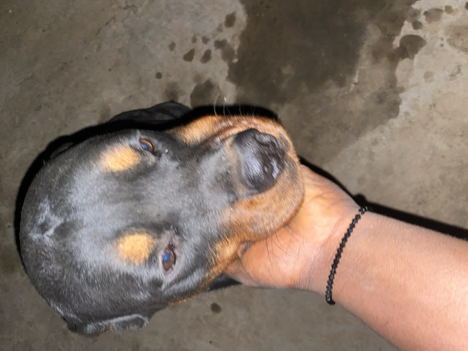 A close-up, high-angle image depicts a black and tan canine, likely a Rottweiler, with prominent tan markings above its blue-hued eyes and on its muzzle