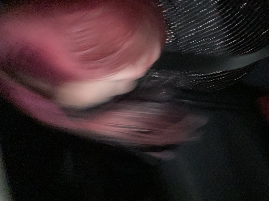 An indiscernible, blurred image features a person with pink hair. The skin is pale and undefined due to the motion blur. A dark, shiny fabric is visible in the background, possibly a piece of clothing or upholstery. The overall impression is one of movement and lack of clarity.