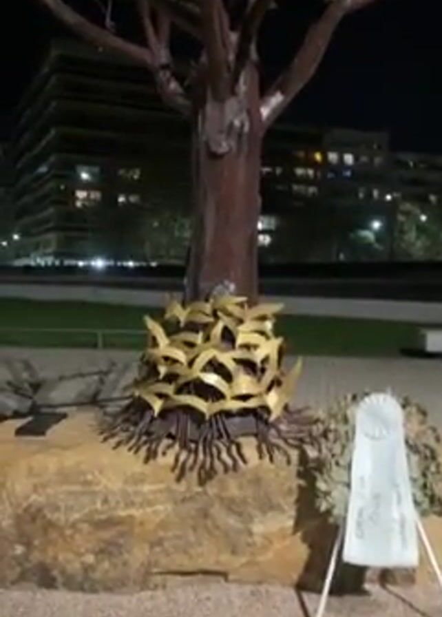 At night, the camera surveys a monument. The monument consists of a short, stylized tree, with a brown trunk and branches. The roots are made of metal with golden, wing-shaped elements. The base of the tree is a stone. Next to the monument is a wreath attached to a wire stand. The ribbon on the wreath reads, “CPR 214 Club”. A modern building is visible in the background. The ground surface is pale gravel. The camera pans slightly.