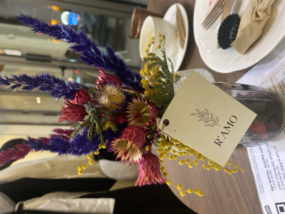 The image displays a small bouquet of dried and preserved flowers in a ribbed, clear glass vase, positioned centrally on a dark brown wooden table. The bouquet comprises prominent deep purple spiky flowers, bright yellow globular clusters resembling mimosa, and various shades of red, pink, and yellow dried flower heads, interspersed with green foliage. A light brown rectangular tag with a stylized leaf logo and the text "R'AMO" is attached to the bouquet by twine. To the right of the vase, a white ceramic plate contains a small reddish residue, a crumpled brown paper liner, and a wooden fork. Behind this plate, a white ceramic teacup with a handle rests on its saucer, holding a light-colored beverage, with two small biscuits on the saucer. Partially visible beneath the vase is a white document with Armenian text, including "ԵՐԵՎԱՆ" (Yerevan), a date "13.03.2026, 19:30", and an address (Zakyan 8 building 15), confirming the location as Yerevan, Armenia. A QR code is also visible on this document. The background, largely out of focus, shows a blurred reflection or view through a glass partition. On the far left, a person's torso, wearing a black garment over a light-colored shirt, is partially visible. On the right, out-of-focus lights indicate an urban environment at dusk or night. A dark brown cup is faintly visible in the far background on the table. The scene suggests an indoor setting, likely a cafe or restaurant.