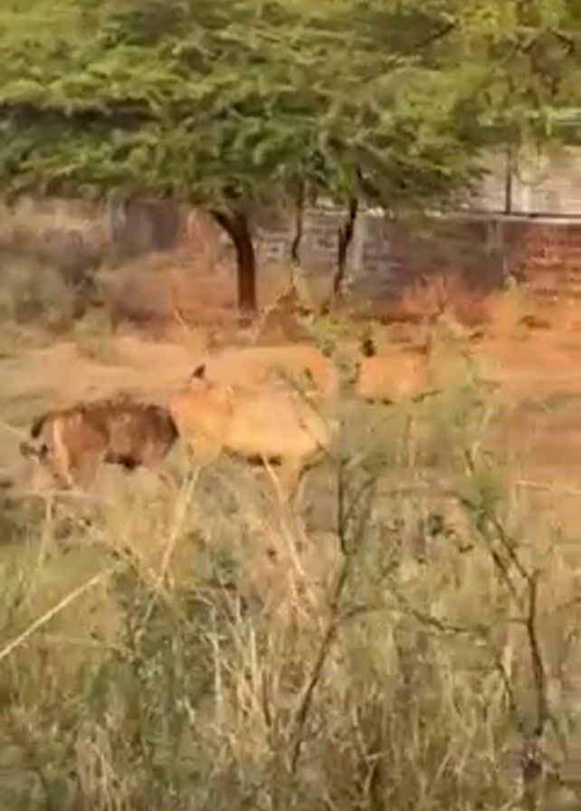 deer at what appears to be a zoo or sanctuary. The video starts with a view through tall dry grass of deer in the distance, partially obscured by trees. The camera then pans across the scene to show a deer standing near a green metal fence, with brick structures in the background. The environment consists of dry grass, trees, and brick structures, suggesting an outdoor enclosure within a park or wildlife reserve. There are no people visible in the video.