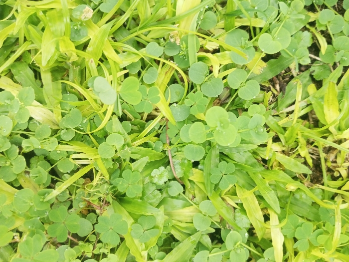 The image presents a close-up, top-down forensic view of ground vegetation in Irupalai, Sri Lanka. The scene consists entirely of green plant life, primarily a dense mixture of narrow-bladed grass and numerous small-leaved herbaceous plants. Distinct plant types include those with three-lobed leaves resembling clover and others with smaller, rounded, often paired leaves. The foliage exhibits varying shades of green, from light lime green to yellowish-green, with visible water droplets on several leaf surfaces. No people, animals, or man-made objects are present. The underlying soil is minimally visible through the thick plant cover.