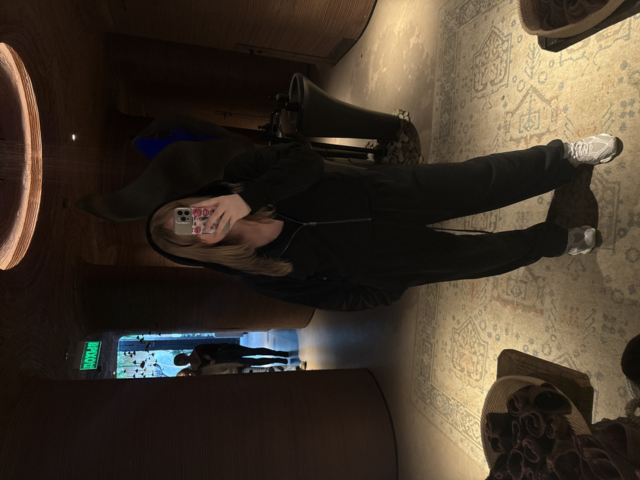 A mirror selfie depicts an individual standing in an indoor facility in Vsevolozhsk, Russia. The subject, with blonde hair, wears a black hooded zippered top, black sweatpants, and grey sneakers, holding a smartphone with a lip-patterned case that covers their face. The room features dark, textured, curvilinear walls and a ceiling with a circular light fixture. A tall, dark, modern pedestal sink, surrounded by decorative stones, is visible to the subject's right, with a large, dark, abstract sculpture featuring a blue accent behind it. The floor is covered by a light-colored, patterned rug. Partially visible in the lower corners are baskets containing rolled dark towels. In the background, two silhouetted figures are visible through a doorway, above which a green, mirrored 'ВЫХОД' (EXIT) sign is illuminated.
