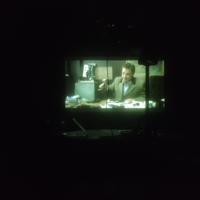 The image displays a projected video frame on a screen, situated within a dark indoor environment in Парэчча, Belarus. The central focus of the projection is a Caucasian male, seated at a cluttered desk. He has short, dark, curly hair and wears a light-colored suit jacket over a striped shirt. He is looking towards the viewer's right and extends his right hand, holding a small, metallic, and reflective object, possibly a key or tool. Within the projected scene, a grey metal safe is visible to the left of the man, and a dark-framed picture hangs on the wall to his right. The desk is covered with numerous papers and various miscellaneous items. The lighting within the projected scene appears artificial. In the immediate foreground of the overall photograph, a dark table surface is visible, upon which an open white object, consistent with a laptop or notebook, rests. A dark, vertical support structure, likely a stand or tripod, is partially visible to the right edge of the projected area. The space surrounding the projection is unlit.
