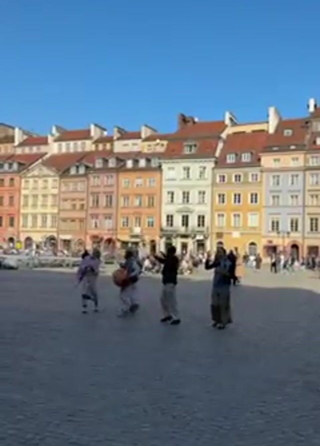 cobblestone plaza with colorful buildings around it, suggesting an old European town. Several people walk around the open area, with a group dancing near the center. The sky is clear and blue. Some individuals appear to be tourists, while others might be locals. A man wearing a plaid shirt passes by the camera. The buildings are several stories high and feature distinct architectural styles.