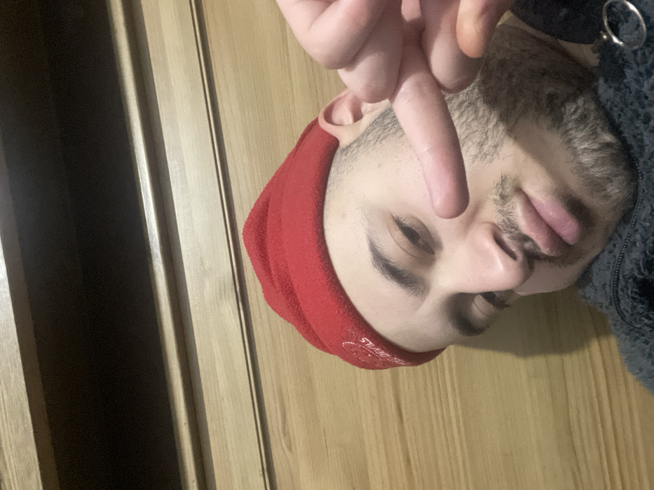 A close-up shot shows a man wearing a red beanie with white lettering. He is indoors, next to a wooden wall or door. The man's face is at an angle, and he is holding up his middle finger. He has dark hair and a beard, and is wearing a grey, fuzzy jacket. A silver ring is visible on the jacket's collar.