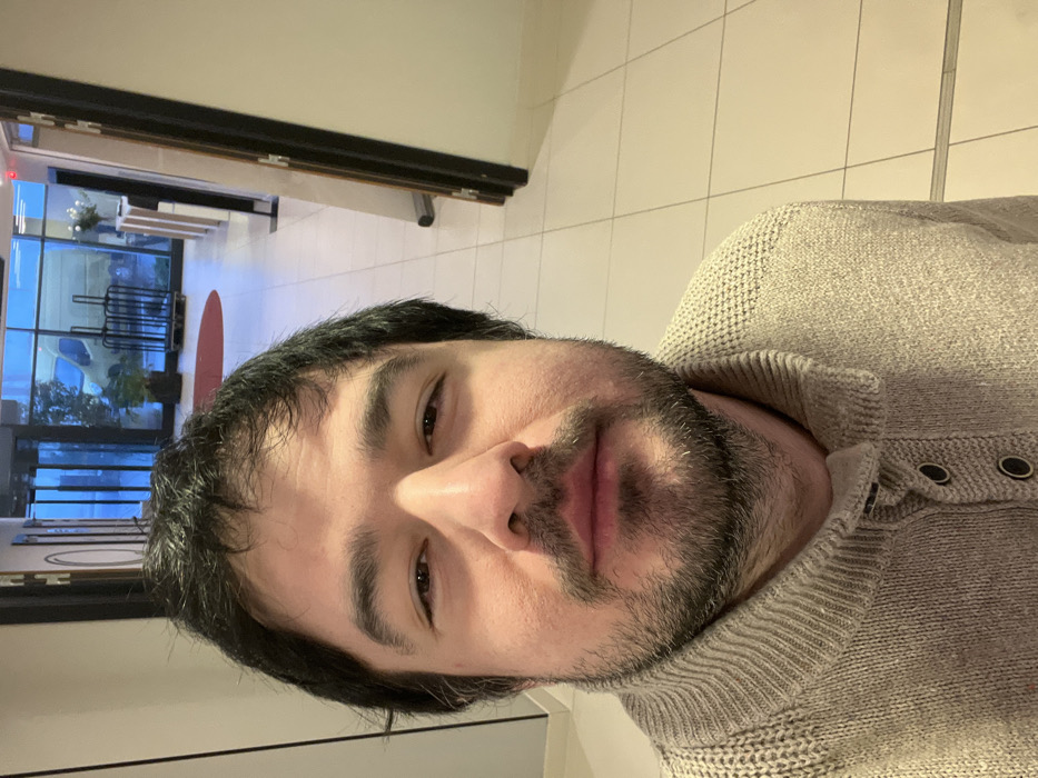 A light-skinned man with dark hair and a beard poses indoors
