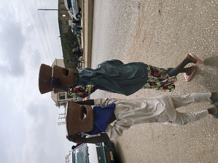 The image depicts an outdoor, daytime scene on a paved road in Gweru, Zimbabwe, under an overcast sky. Two individuals are shown from behind, walking away from the viewer, both balancing containers on their heads. The individual on the left wears a light-colored, long-sleeved top and matching trousers, with a blue head covering visible. They are supporting a single, brown, unglazed pottery or clay container, featuring lateral perforations, on their head with their raised left arm. The individual on the right wears a multi-colored patterned dress, a dark outer garment, and pink slip-on sandals. They are carrying two identical stacked containers on their head, supported by their raised right arm. In the mid-ground, a white van is partially visible on the left. To the right, a street runs parallel, populated by several people, a motorcycle, and a light-colored sedan. The background includes a multi-story building with a light-colored facade, an adjacent unfinished or damaged building structure, and sparse vegetation. Utility poles and overhead wires are visible against the sky. The road surface appears damp or reflective in areas.