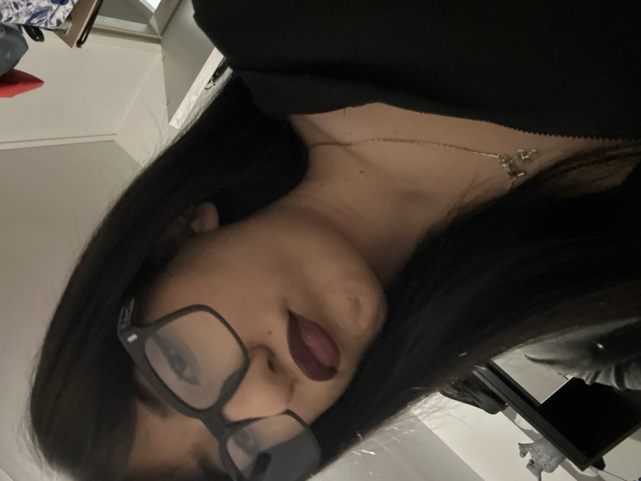 A woman with long, dark hair and glasses gazes into the camera. She wears a black top and a delicate gold necklace with a pendant. Her lips are slightly parted, revealing a hint of her tongue. The angle is canted, giving a skewed perspective. In the background, a glimpse of a room can be seen, including furniture and possibly bedding. The overall image has a casual, intimate feel.