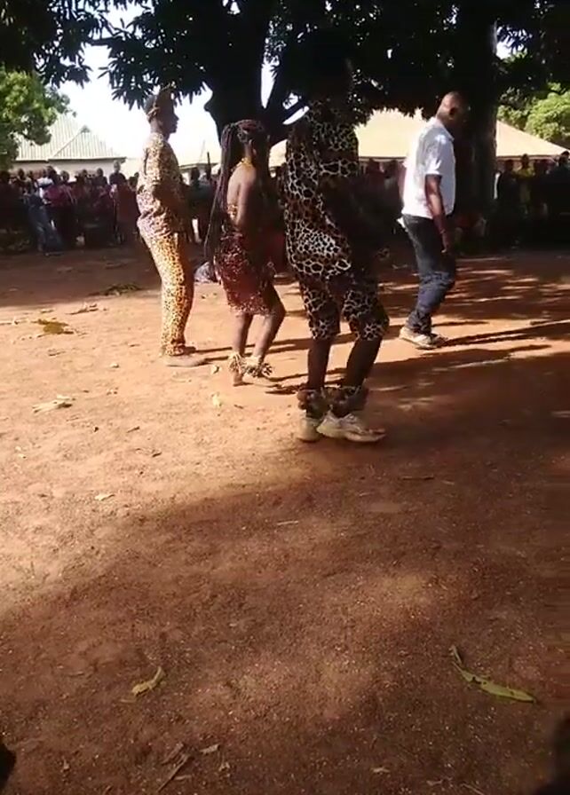 group of people dancing in a dirt clearing. In the foreground, three figures stand out: a person on the left wearing a leopard-print outfit, a smaller figure in the middle with braided hair wearing an animal print skirt, and another person to the right also wearing a leopard-print outfit. They are moving to the beat of music, seemingly performing a traditional dance. Anklets on the feet of the dancer on the right stand out. Behind them, a man in a white shirt and dark pants is dancing as well. In the background, a crowd of people watches from under the shade of trees. A building is visible in the background on the right. The lighting is bright, with shadows cast by the trees. The camera is somewhat unsteady and handheld.