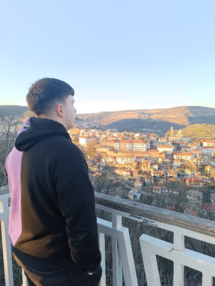A solitary young adult male is captured in profile, standing on an elevated viewing platform in Veliko Tarnovo, Bulgaria, observing a panoramic cityscape