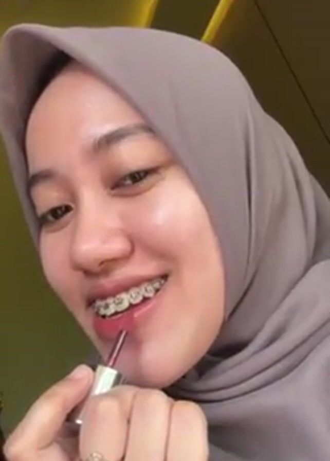 A woman wearing a taupe hijab applies lip gloss in front of a yellow background. She has braces on her teeth and a ring on her left ring finger. She smiles slightly as she applies the lip gloss. The lighting appears to be from an overhead light.