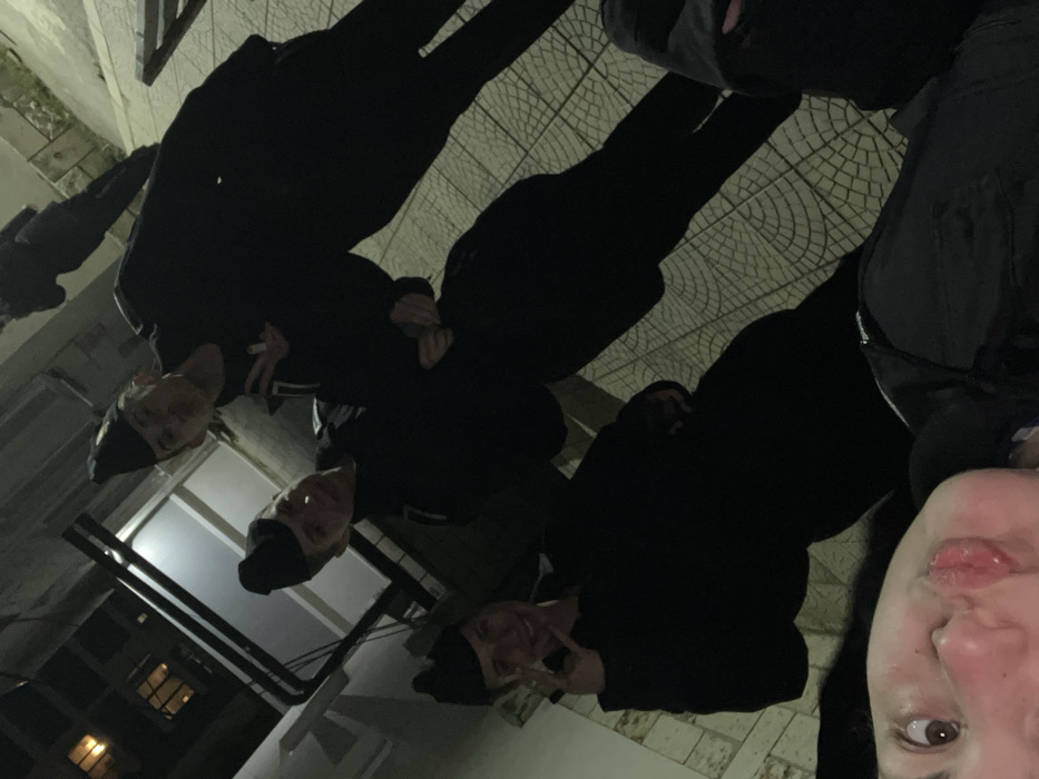 A low-angle, artificially lit photograph captures a group selfie, likely taken at night or in a dim outdoor passageway