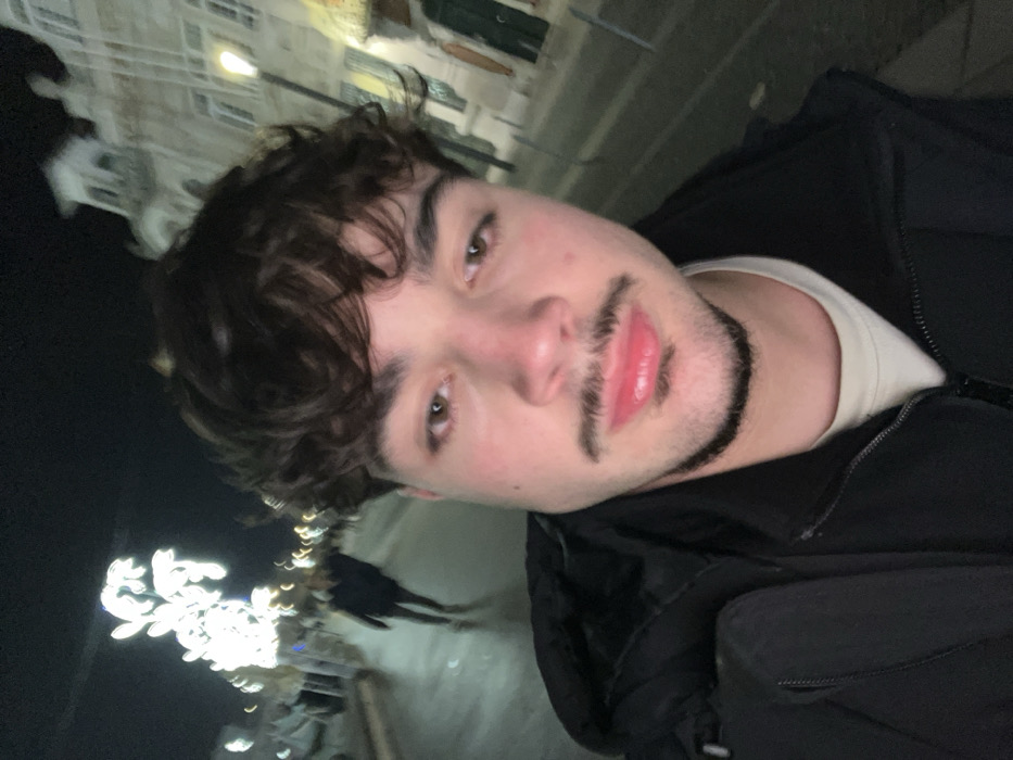 A young man with curly brown hair poses for a selfie outdoors at night
