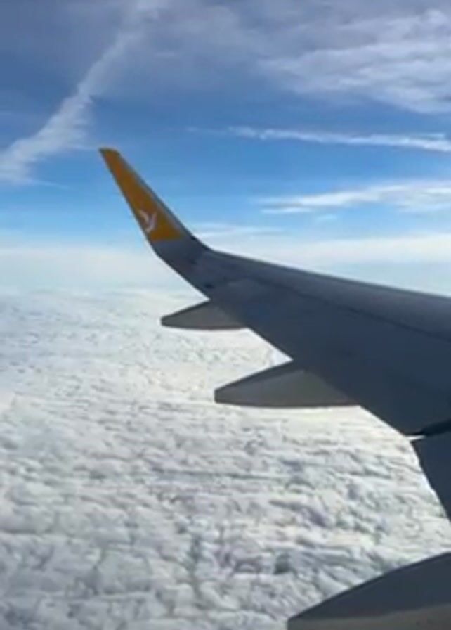 view from an airplane window. The wing of the plane, marked with a yellow bird logo, is visible against a backdrop of dense, white clouds below. Above, a blue sky is partially covered with thin, wispy clouds. A contrail from another aircraft crosses the scene diagonally in the upper left.