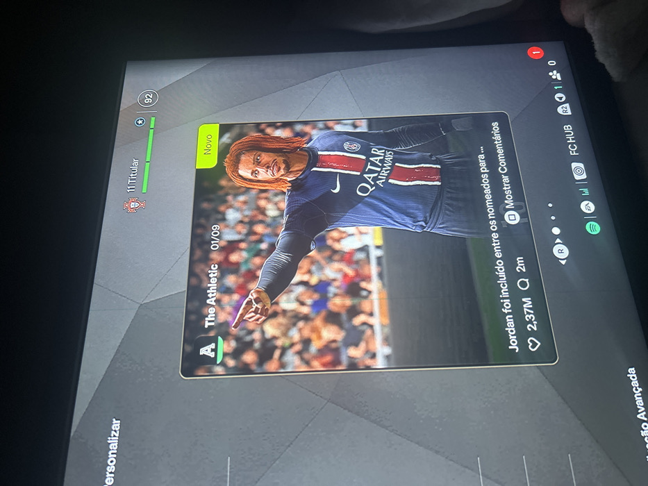 digital display, possibly a tablet, featuring a screen capture from a sports game, likely FIFA. The screen displays a card or profile of a soccer player, Jordan, wearing a Paris Saint-Germain jersey. The card indicates the source as "The Athletic" and is marked as "Novo" (new). The interface includes information on the player's statistics and comments, alongside the game's navigation and social elements such as likes and shares. The device's interface is in Portuguese.