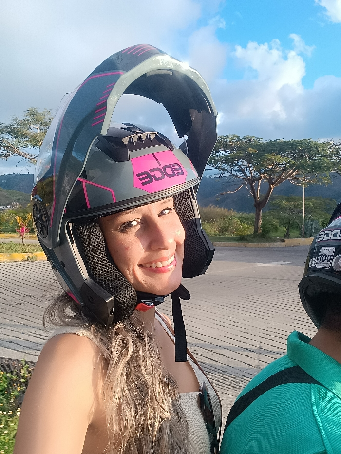 A woman in a gray and pink motorcycle helmet smiles. The helmet has the word "EDGE" written on its side. She wears a light-colored top with straps. Beside her is a person wearing a green shirt and a dark helmet with a sticker. The background includes a road, trees, and a blue sky with clouds. The picture seems to be taken outdoors, possibly during a ride.