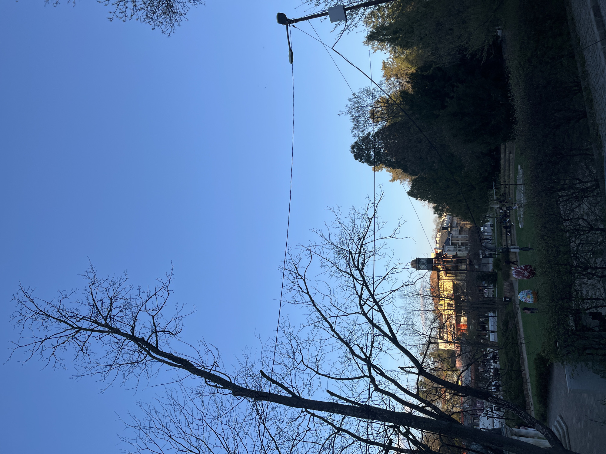 The image depicts an upward view in Bankya, Bulgaria, focusing on a predominantly clear blue sky framed by bare tree branches and a portion of a park. A street lamp and power lines are visible extending across the sky. The lower right portion of the image shows a park pathway lined with green trees and bushes, with visible buildings in the background. Three decorative, large, egg-shaped objects are on the grass. Individuals can be seen walking along the pathway. The photo seems to be taken in early spring due to the lack of leaves on the trees.