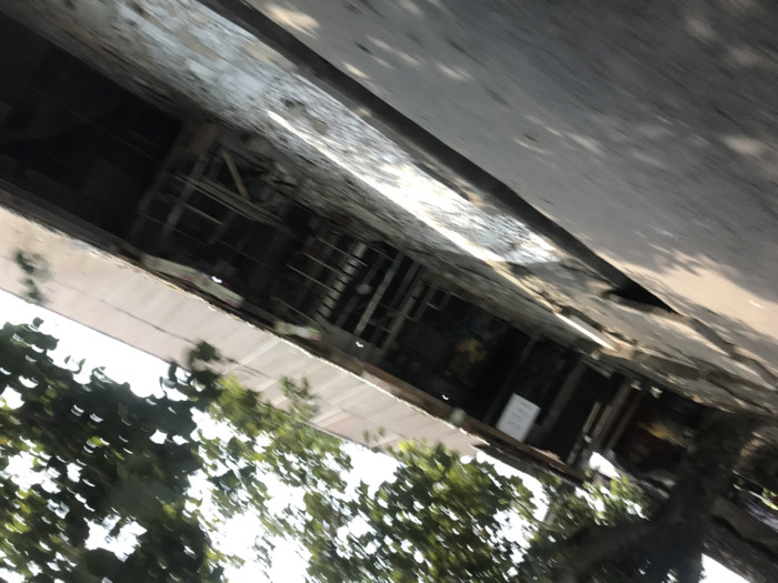 The image, captured at a steep diagonal angle with significant motion blur, depicts an urban roadside environment in Calabar, Nigeria. A row of low-rise structures, consistent with commercial shops or stalls, occupies the middle ground. These buildings feature open storefronts, some revealing interior shelving or basic wooden and metal frameworks, and are topped with corrugated metal roofs. A light-colored, illegible sign is affixed to one of the central structures. The ground directly in front of the buildings appears uneven and comprised of dirt and rubble. In the foreground, a gray paved road surface shows signs of wear, running parallel to a dark, distinct drainage channel. A large tree with dense green foliage is visible on the upper left, casting shadows. No individuals, specific objects, or actions are clearly discernible due to the image quality.