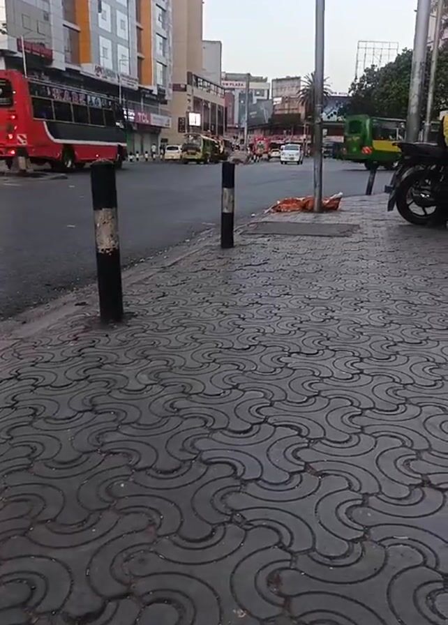 city street intersection with a decorative gray brick sidewalk in the foreground. Two black bollards with white paint on top and a metal light pole are situated along the sidewalk. In the background, city traffic, including red and green buses, a white car, and other vehicles, move through the intersection. Buildings of various heights and designs line the street, with advertisements and signs visible on some of them. A motorcycle is parked to the right of the frame. There are some people walking around at a distance. The overall lighting suggests it is either early morning or late afternoon. The sky is overcast.