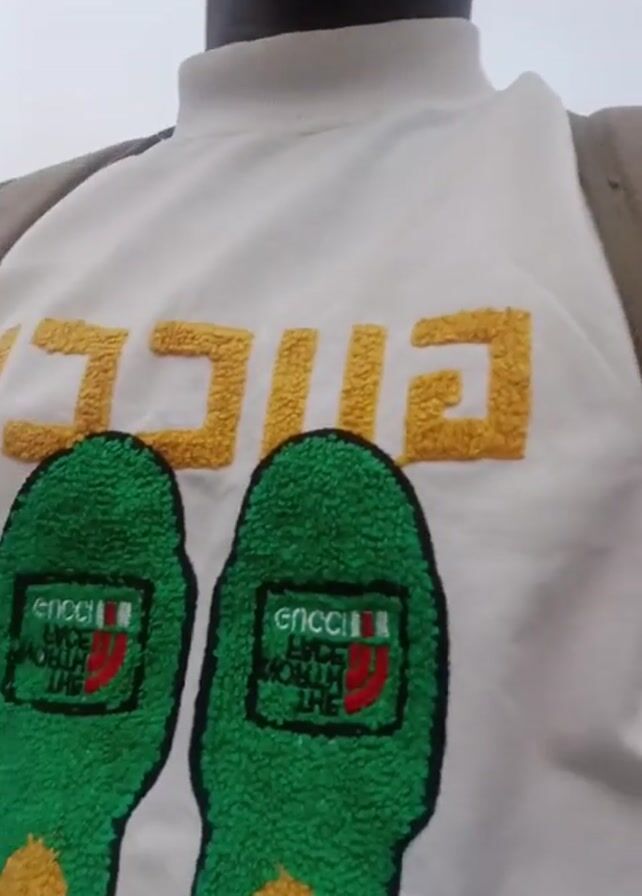 person wearing a white turtleneck sweater with a large "Gucci" logo in yellow. Underneath the logo are two green, fuzzy shapes resembling shoes. Inside each shoe is a smaller emblem featuring the word "Gucci" above other text and a design with the colors of the Italian flag: green, white, and red. The person's face is mostly out of view, with only the lower part of their face and neck visible. The background is blurry, suggesting movement. The video seems to be shot from a low angle, possibly held at chest level.