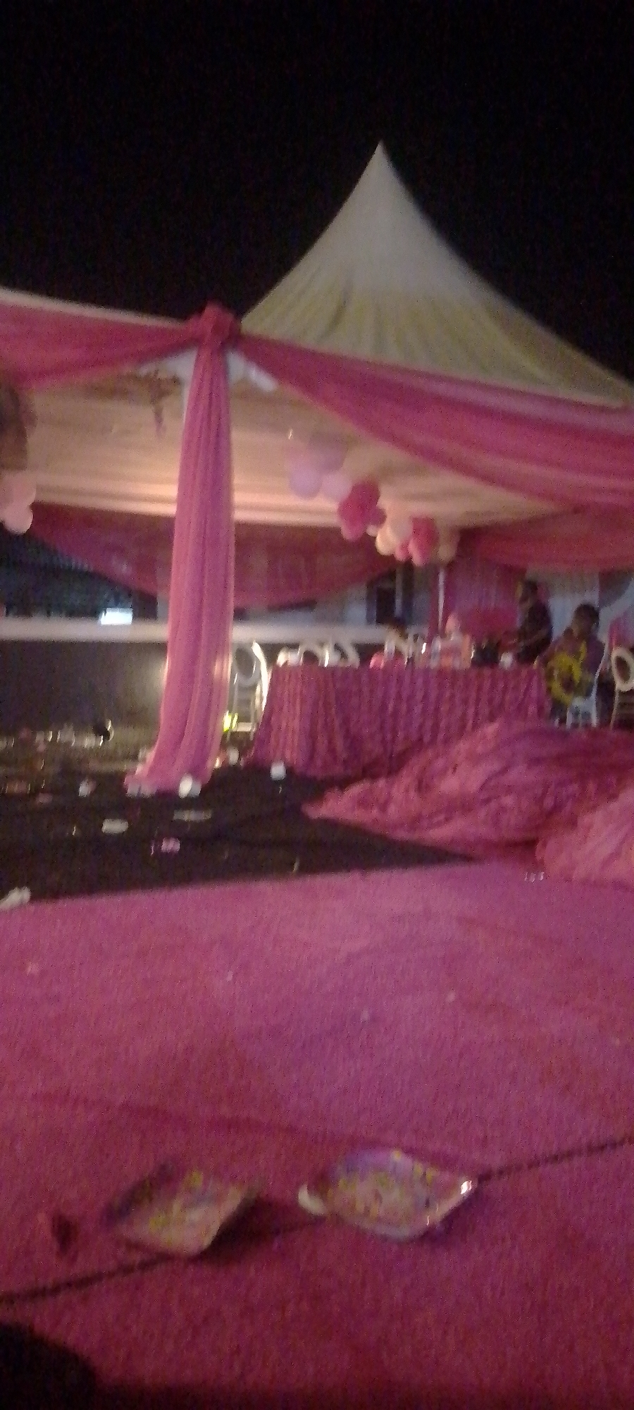 The image depicts an outdoor event in Iranla, Nigeria, at night. A large tent with a conical top is decorated with pink and white fabric drapes and balloons. Two people are seated at a table covered with a pink tablecloth. The floor is carpeted in pink, with scattered debris on a dark section. Two decorative items resembling leaves or petals lie on the carpet in the foreground.