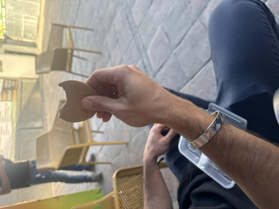 A person wearing a silver bracelet with black and white diagonal patterns is holding a round, light brown cookie with a bite taken out of it. The person is wearing dark blue jeans and is sitting on a metal chair. A clear plastic container is on their lap. The scene appears to be outdoors, possibly on a patio, with paving stones visible in the background. A reflection shows more tables and chairs.