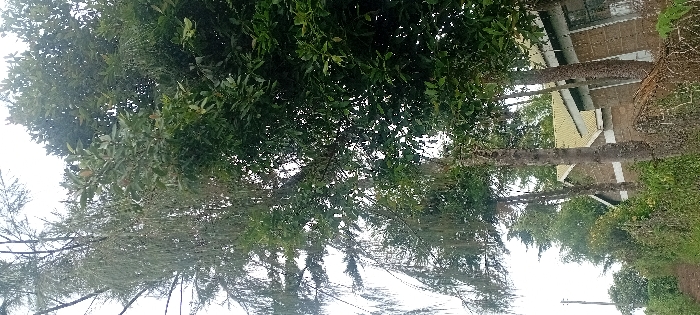 A natural scene shows tall trees, some with dense green leaves and others with needle-like foliage, reaching high into the sky. A building with a beige roof and white walls can be seen in the background, partly obscured by the trees. A dirt path runs along the side, and a few smaller bushes and plants are visible at the bottom, with a utility pole in the distance.